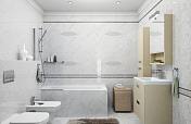 Коллекция Cassiopea тоже может гордиться своей красотой. Вся драгоценность заключается в естественной передаче белого каррарского мрамора с выраженными серыми прожилками. Это один из самых популярных материалов для облицовки ванной комнаты. Горная порода наделяет интерьер благородством и сдержанной роскошью.