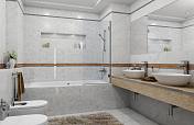 Настенная плитка 20х60 представлена в двух вариантах: с гладкой глянцевой поверхностью и объёмной трёхмерной мозаикой. Чипы псевдомозаики неровные, одни немного выступают, другие как будто проваливаются внутрь. Такая техника выглядит необычно и эффектно. Глянцевая поверхность базовой плитки выгодно контрастирует с керамогранитом 38,5х38,5, покрытым матовой глазурью.