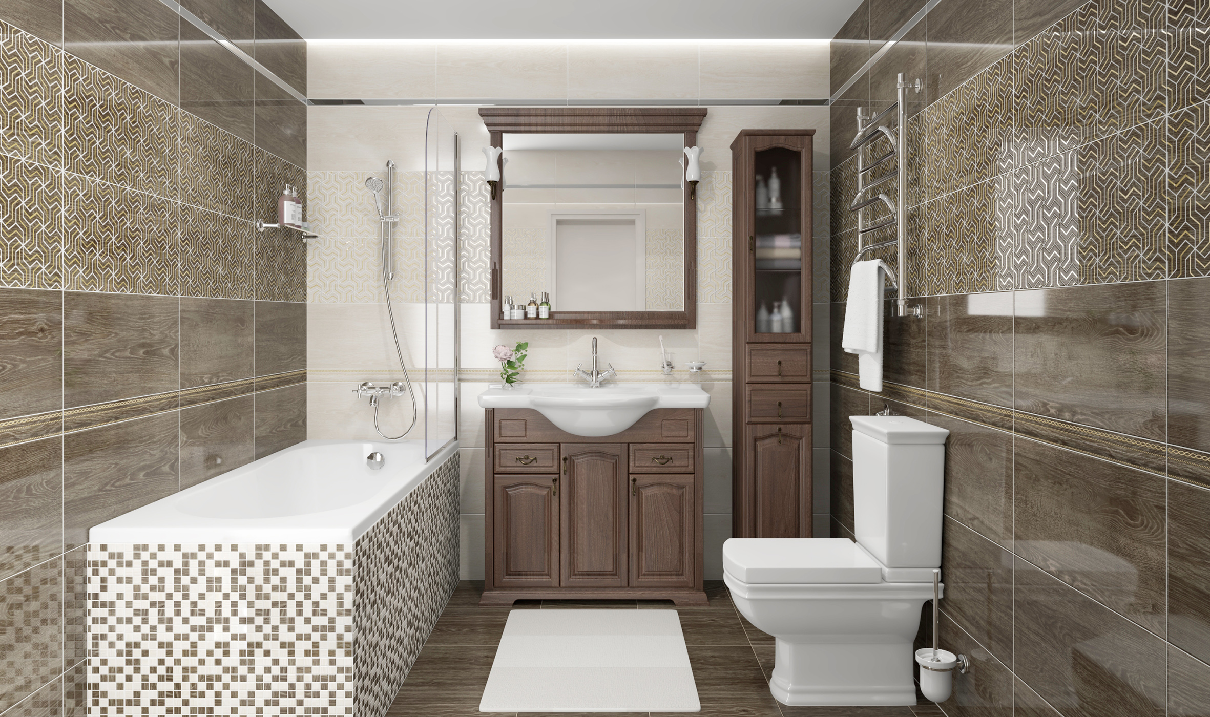 В коллекции Genesis вы найдёте потрясающее воплощение экостиля. Благодаря современной цифровой печати имитация дерева реалистично передаёт естественные оттенки и многообразие рисунков древесных волокон. Палитра керамической плитки состоит из природных цветов – коричневый, бежевый и тёмно-бежевый. Поможет добавить ритмичность в дизайн декор Fractal. На модуле тугоплавкой эмалью нанесён фрактальный орнамент из белых и жёлтых линий на фоне древесины. Для облицовки неровных поверхностей отлично подойдёт псевдомозаика из микса разноцветных чипов под дерево.